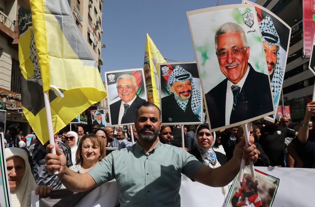 9月23日,在约旦河西岸城市纳布卢斯,民众挥舞巴勒斯坦领导人阿拉法特和阿巴斯画像参加庆祝活动。新华社发(尼达尔·艾仕塔耶摄)