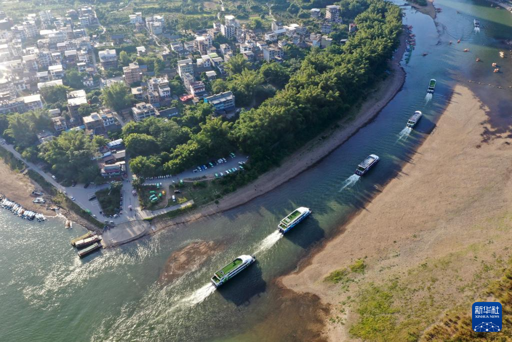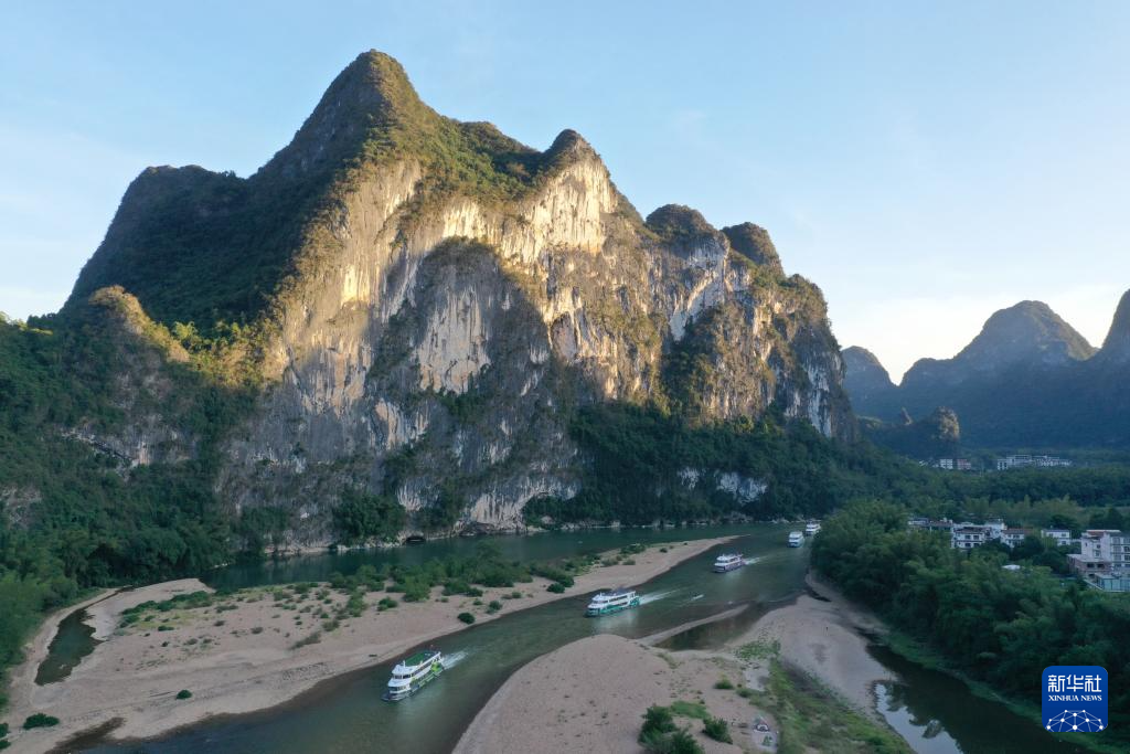 10月24日,游船在广西桂林市阳朔县漓江河段航行(无人机照片)。新华社记者 陆波岸 摄