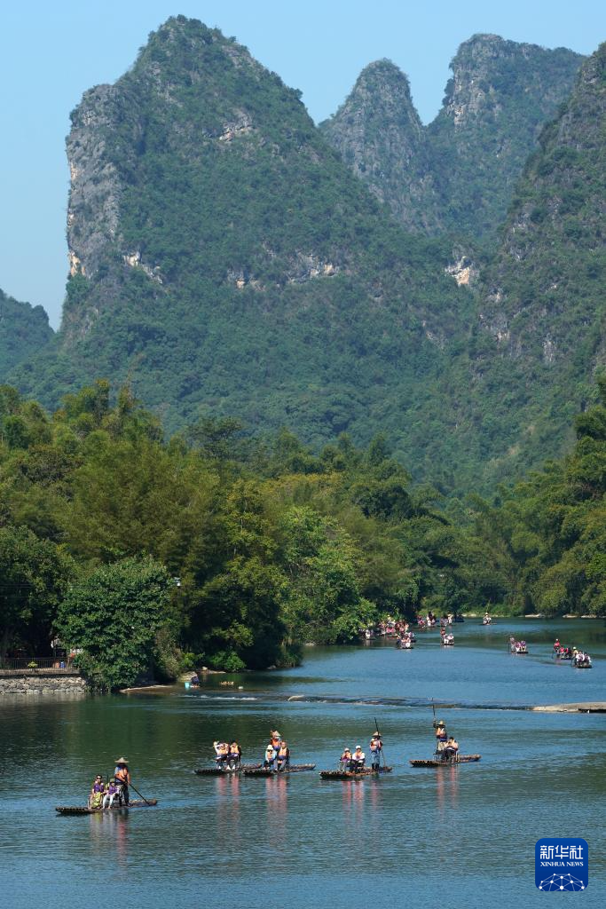 10月25日,游客在广西桂林市阳朔县境内的漓江支流遇龙河上乘坐竹筏游览。新华社记者 马宁 摄