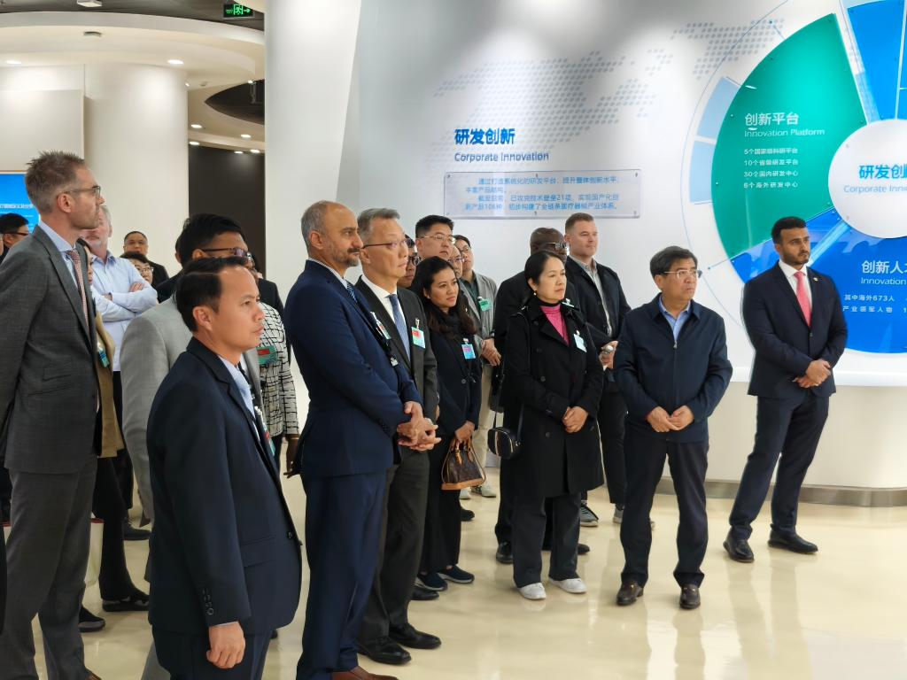 10月24日,外国驻港领团和商界参访团在威海市威高集团参观。新华社记者 陆芸 摄