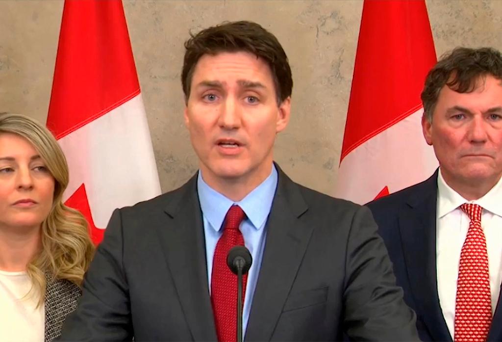 2025年2月1日,加拿大总理特鲁多(中)在渥太华接受媒体采访(视频截图)。新华社发