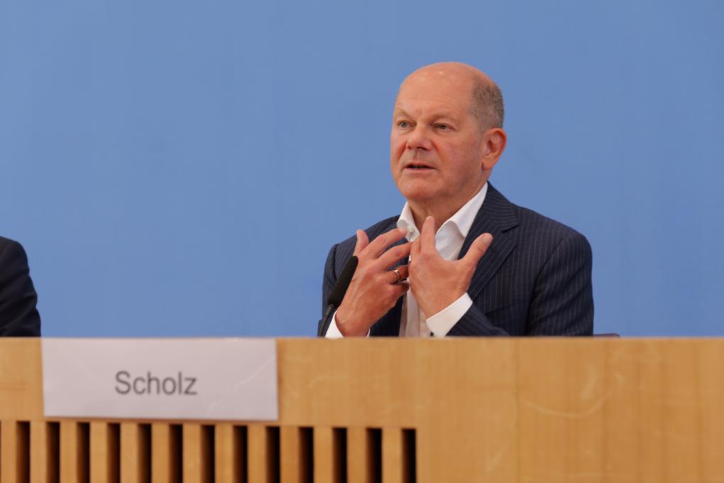 2024年7月24日,德国总理朔尔茨在柏林举行的新闻发布会上讲话。新华社记者李函林摄