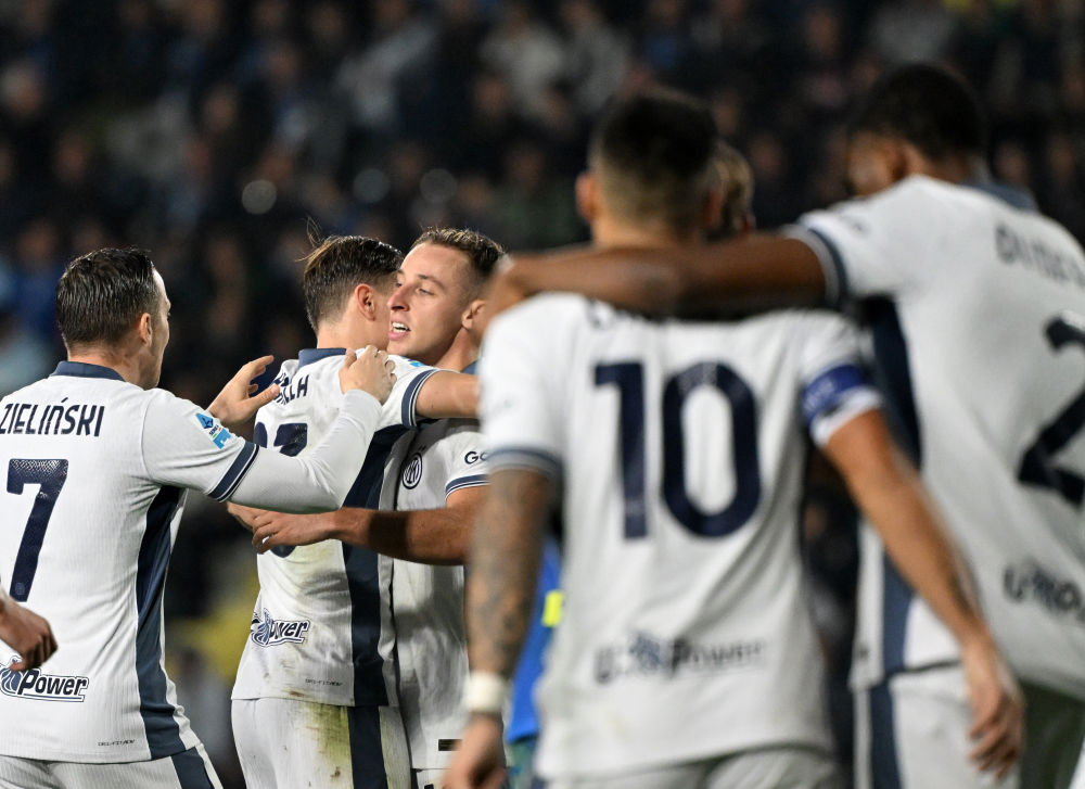 10月30日,国际米兰队球员弗拉泰西(左三)在比赛中打入本场个人第二粒进球后与队友庆祝。新华社发(阿尔贝托·林格利亚摄)