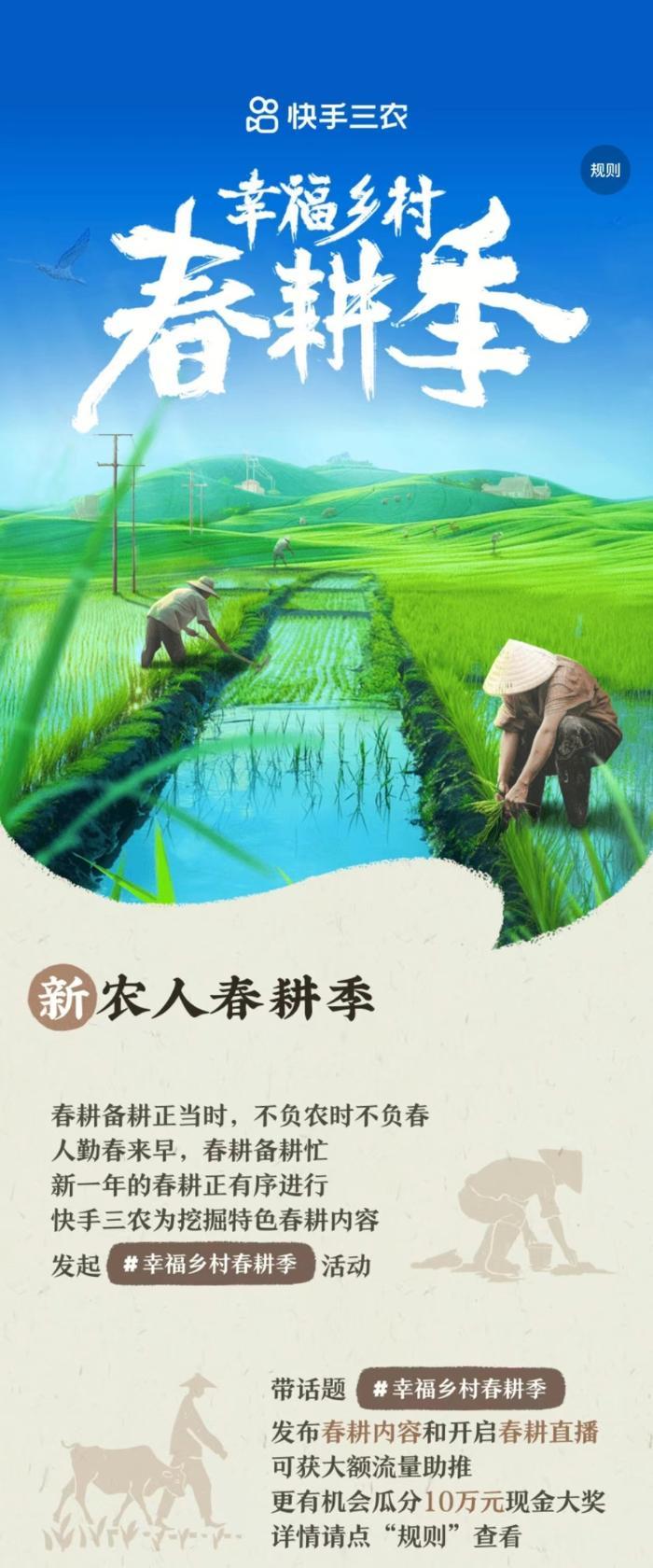 活动期间,用户带#幸福乡村春耕季话题,发布春耕相关短视频或开启春耕直播,即可获得活动专属流量扶持,并有机会参与瓜分10万元现金大奖。