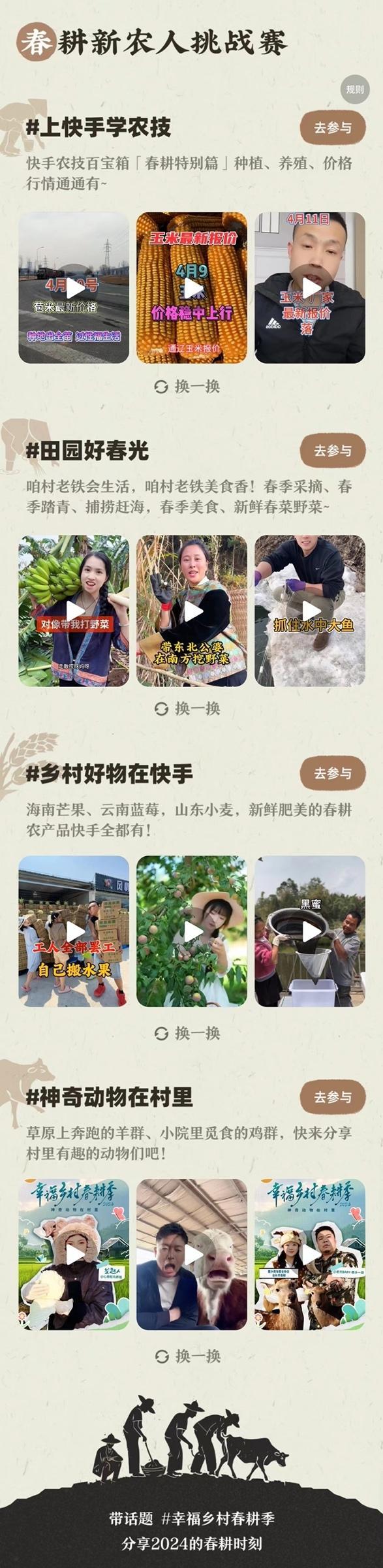 俗话说:春来万物生。随着春风送暖,全国各地也陆续进入春耕时节,田间地头逐渐焕发出勃勃生机。为进一步传播春耕农技知识、展示春耕成果、助力农业发展,值此万象更新的节点,快手三农上线2024“幸福乡村春耕季”系列活动,通过春耕短视频话题征集、春耕直播大场、上快手学农技等玩法互动,为三农用户提供丰富多元的农技知识,鼓励更多三农创作者创作记录自身春耕生活,更好展现乡村新面貌,为乡村振兴发展提供助力。