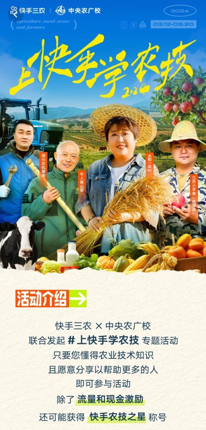 与此同时,为进一步挖掘优秀农技创作者,普及传播农技知识,快手三农还携手中央农广校联合发起#上快手学农技专题活动,用户只需带#上快手学农技话题发布种植业、林业、养殖业等行业相关短视频,分享实用技术、经验,即有机会获得流量扶持、综合排名TOP30的创作者瓜分万元现金,优质作品加入农技知识图谱,优秀创作者更有机会受邀参与线下“农技之星大赛”,与更多优质农技创作者同台竞技。