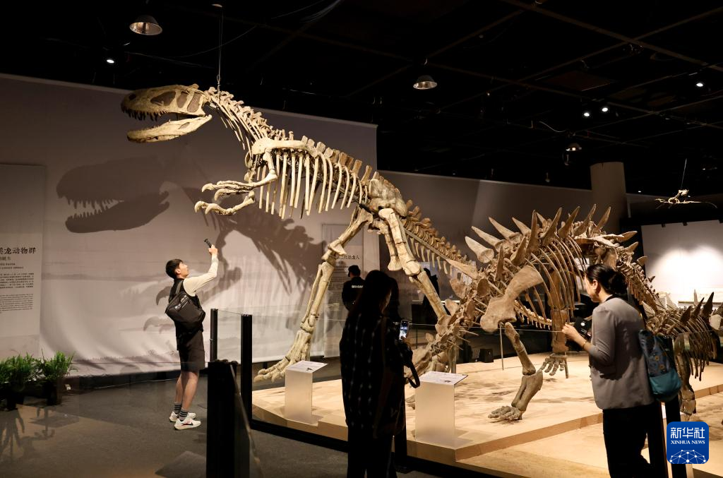 5月26日,参观者在一组恐龙群落化石展品前驻足。新华社记者 方喆 摄