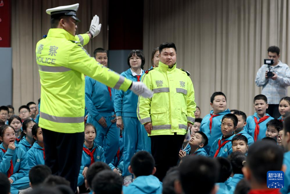 2月19日,乌鲁木齐市公安局交通警察支队民警在乌鲁木齐市第一小学开展交通安全宣传活动时,与孩子们互动做游戏。