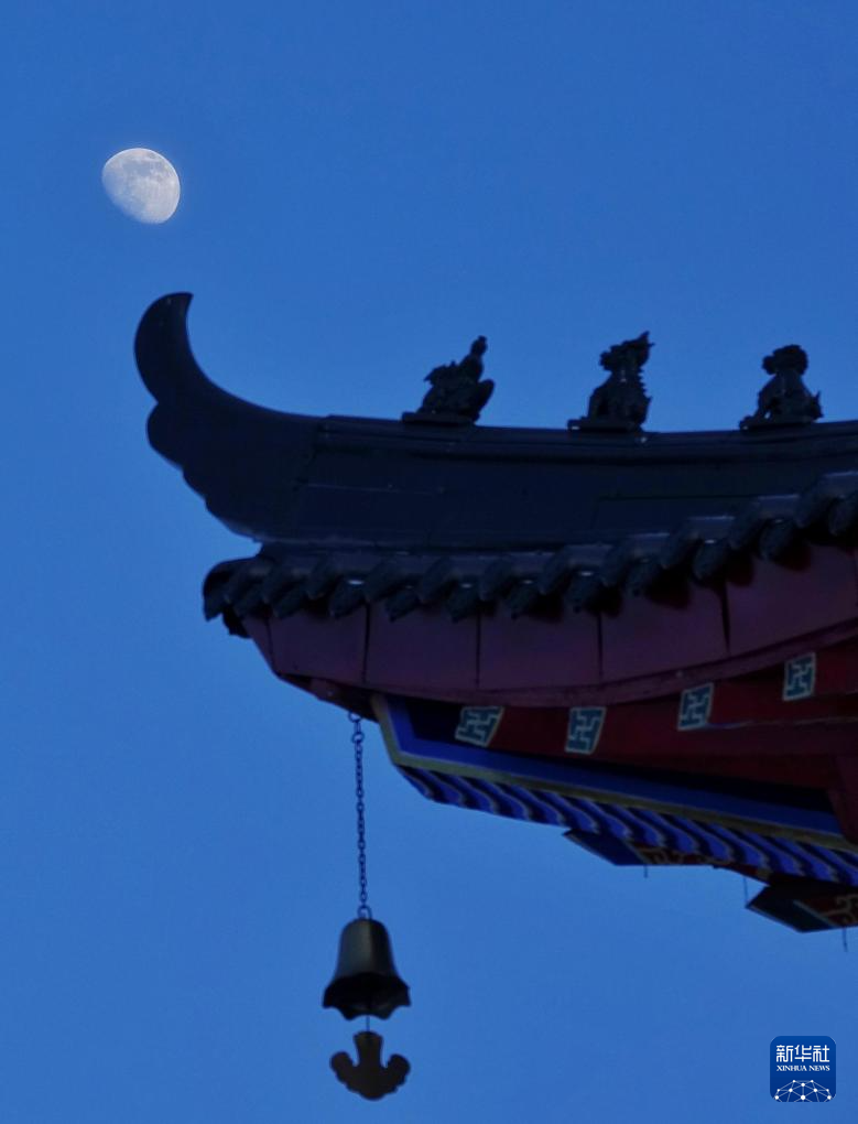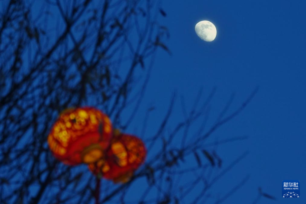 1月29日,在黑龙江省同江市,灯笼与月亮相映成趣。新华社发(刘万平摄)