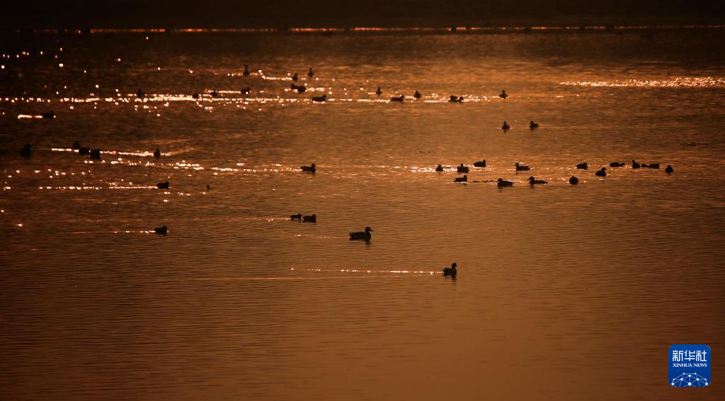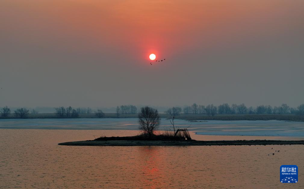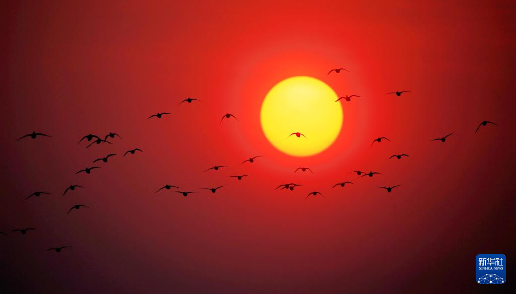 3月22日,一群候鸟在松花江哈尔滨段上空迎着旭日飞翔。
