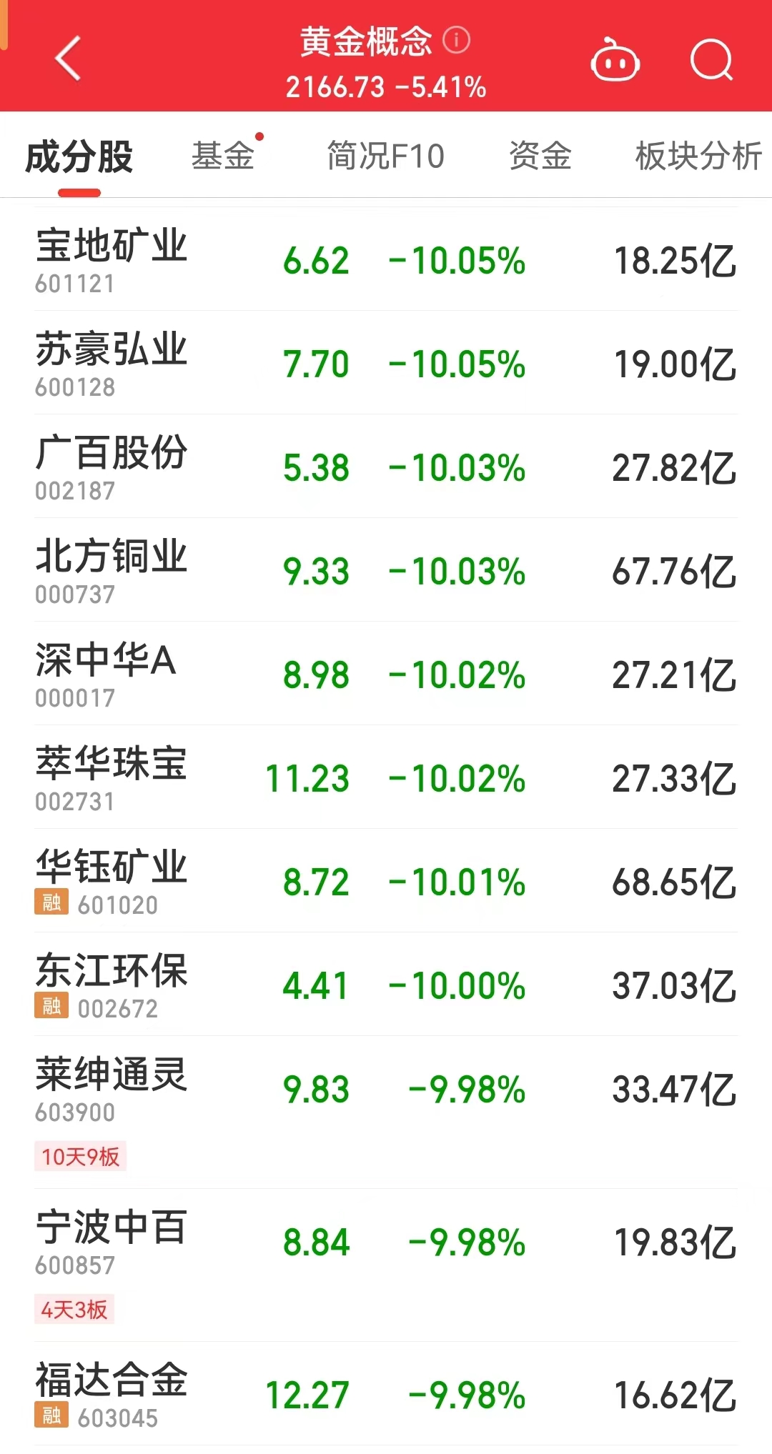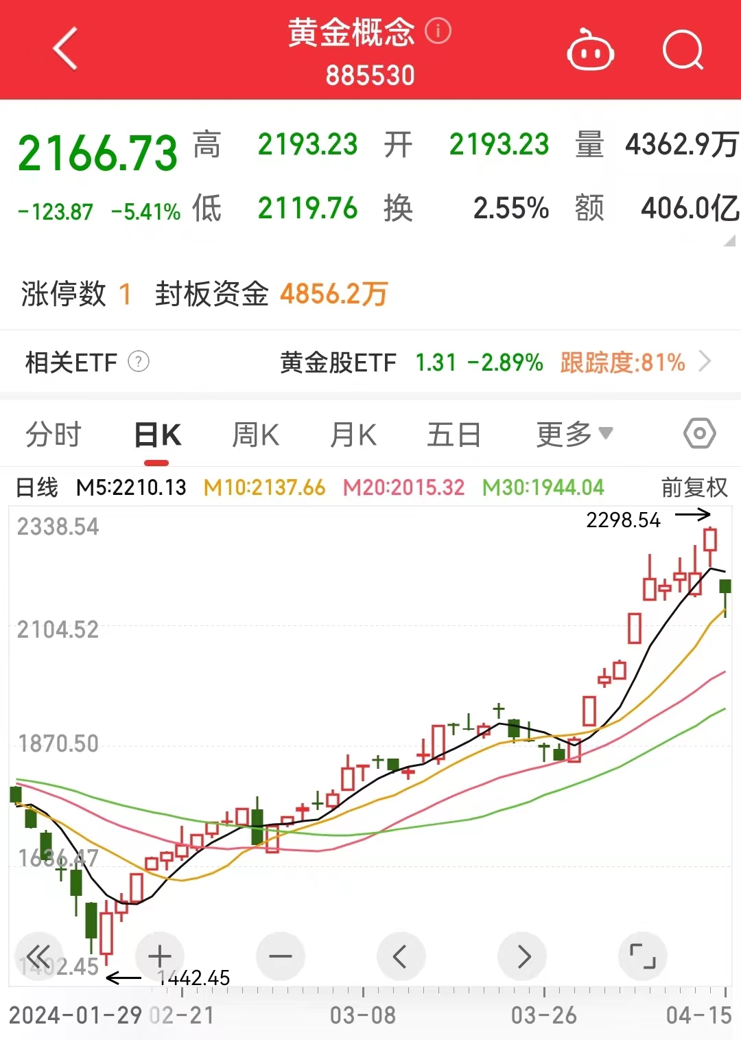 中新网4月15日电 4月15日,此前连续多日上涨的黄金概念全天走弱,收盘大跌5.41%。宝地矿业、苏豪弘业、广百股份、萃华珠宝、华钰矿业等相关个股纷纷跌停。4月12日,国际金价出现回调,伦敦金现、COMEX黄金期货集体收跌。(中新财经)