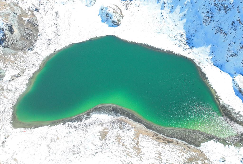 2024年11月12日在四川省甘孜藏族自治州稻城亚丁景区拍摄的“牛奶海”。(无人机照片)CICPHOTO/王建中 摄