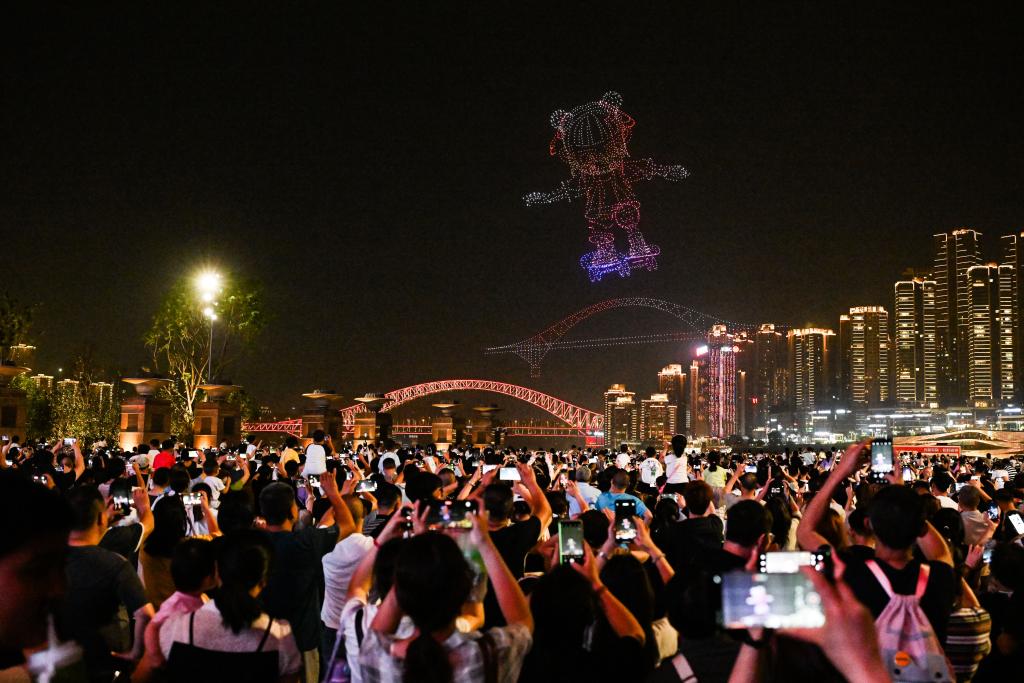 5月2日晚,游客在重庆朝天门广场观看无人机灯光秀。新华社记者 王全超 摄