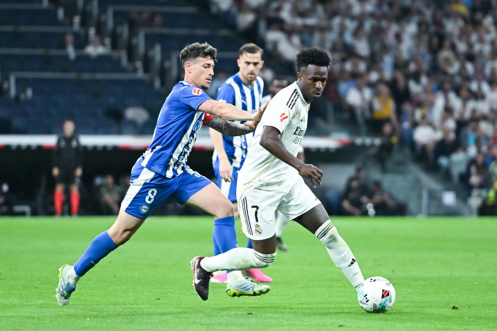 4月21日,皇家马德里队球员维尼修斯(右)和阿拉维斯队球员布兰科(左)在比赛中拼抢。新华社发(古斯塔沃·巴连特摄)