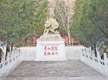 沿着陡峭的石阶向上看,一座巍峨的石雕矗立在崖壁之前,“青山英烈忠魂永存”8个大字在阳光下格外鲜艳。石雕前的空地上,不知何人放上几束鲜花,环顾四周,郁郁苍苍的松柏,显得格外肃穆,与青山绿水共同守护这些身处异乡的“忠魂”。