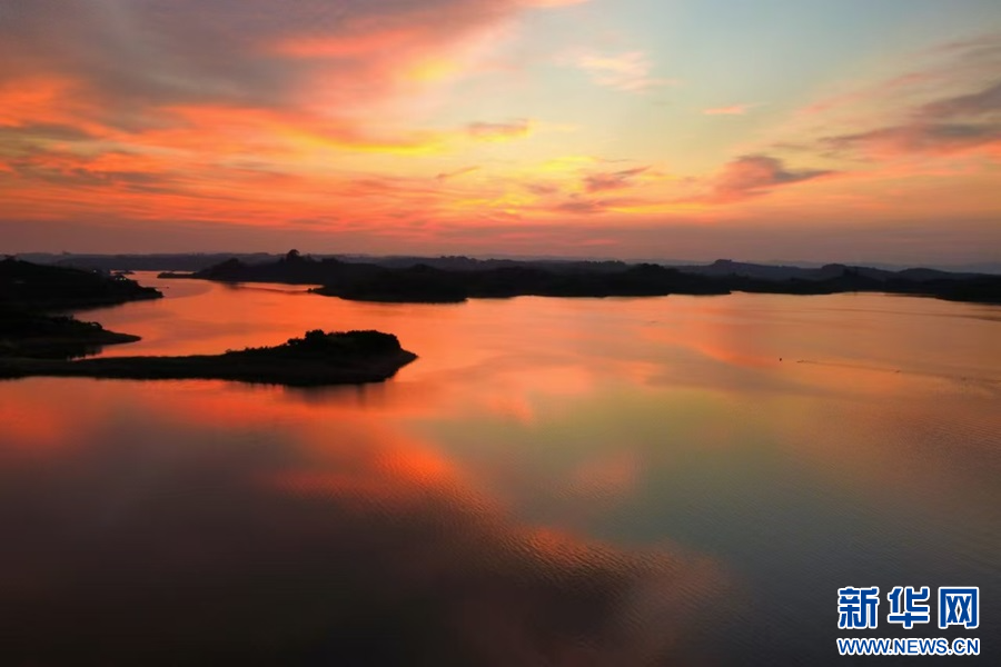 余霞散成绮,映照于长寿湖水面,水天一色,绮丽梦幻。新华网发(邓雪峰 摄)