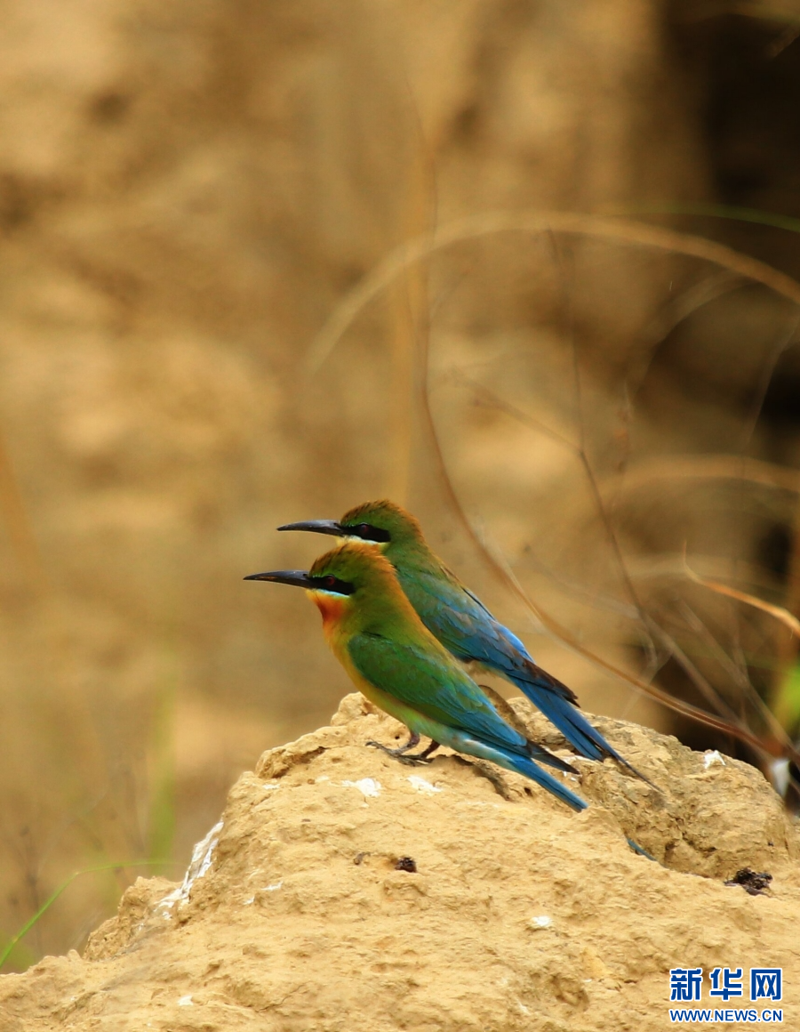 云南保山潞江坝,栗喉蜂虎叼着虫儿相互喂食(5月17日摄)。新华网发(赵辉 摄)