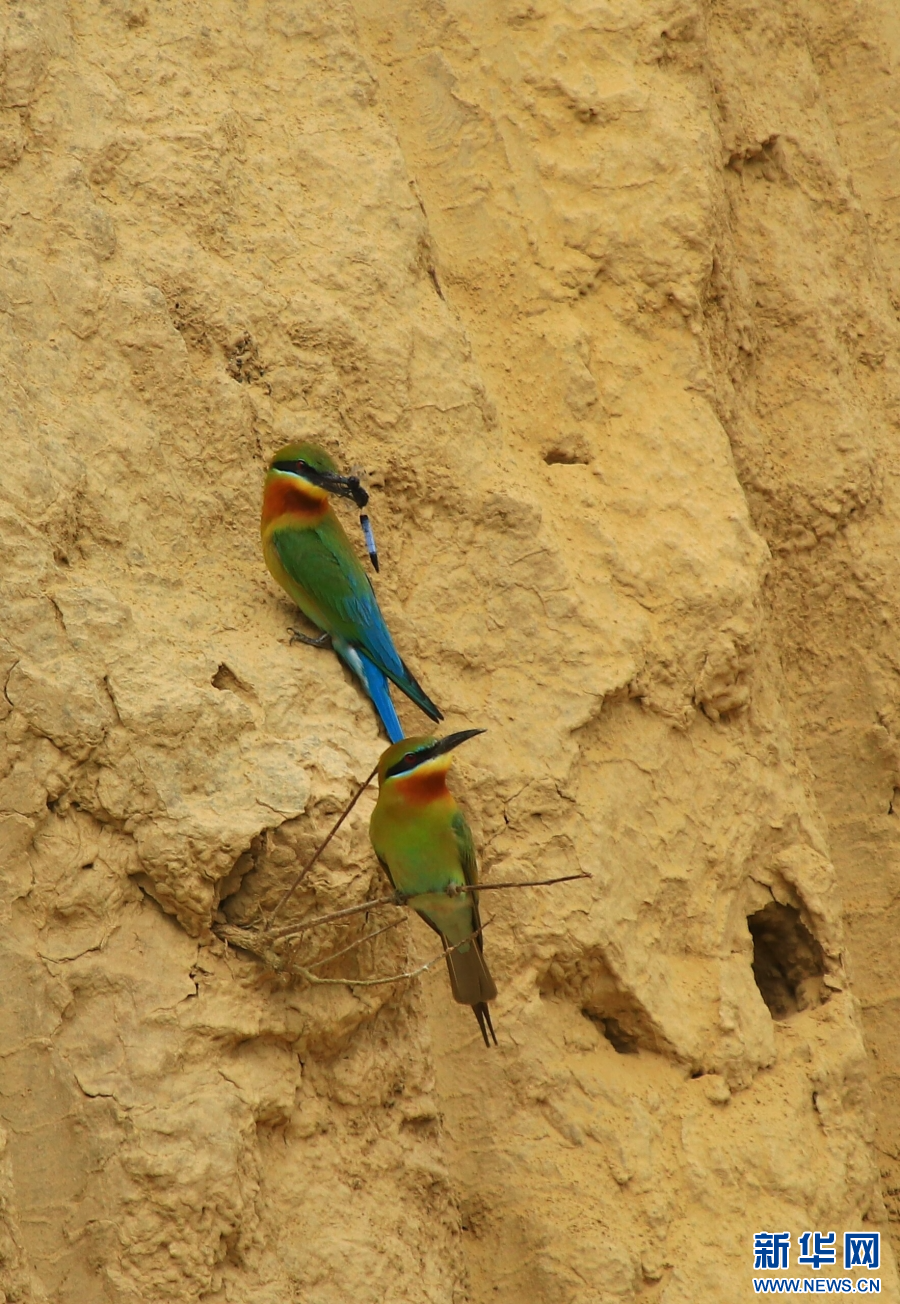 云南保山潞江坝,栗喉蜂虎在沙崖上筑巢安家(5月17日摄)。新华网发(赵辉 摄)