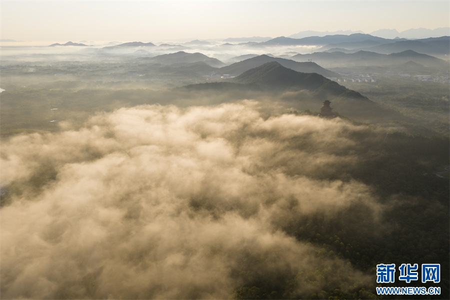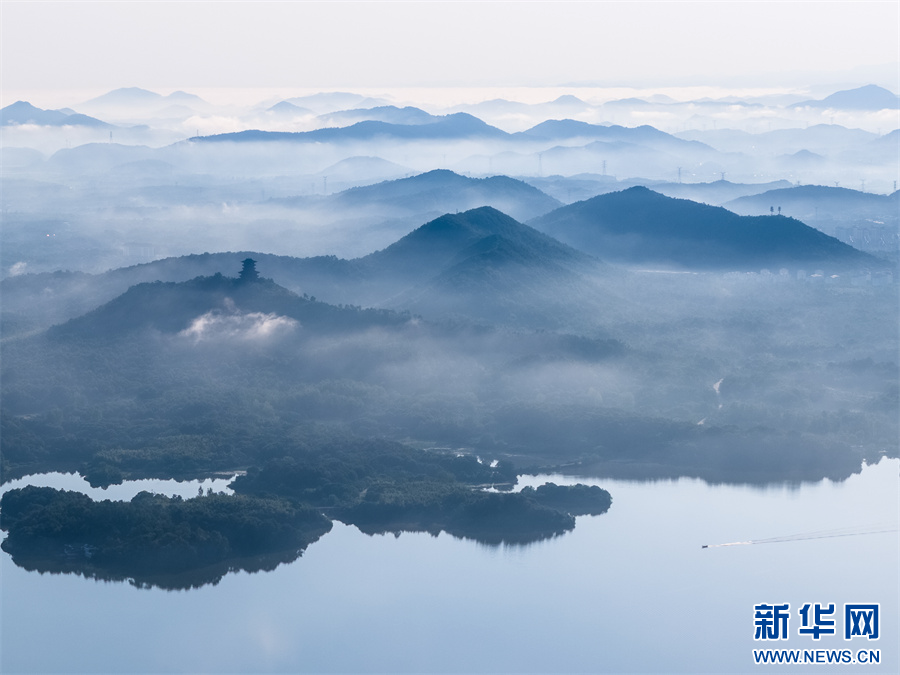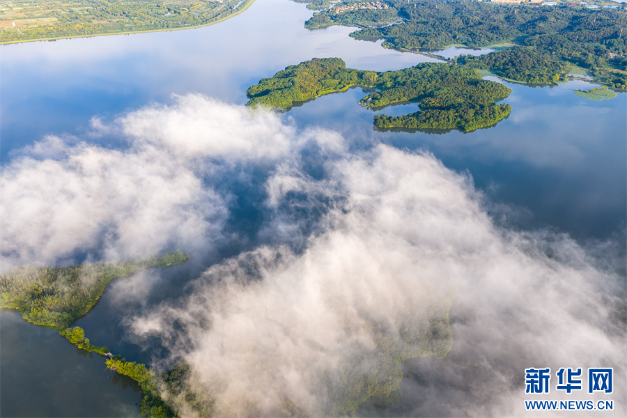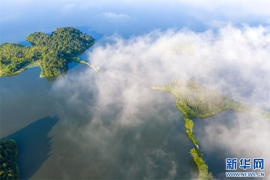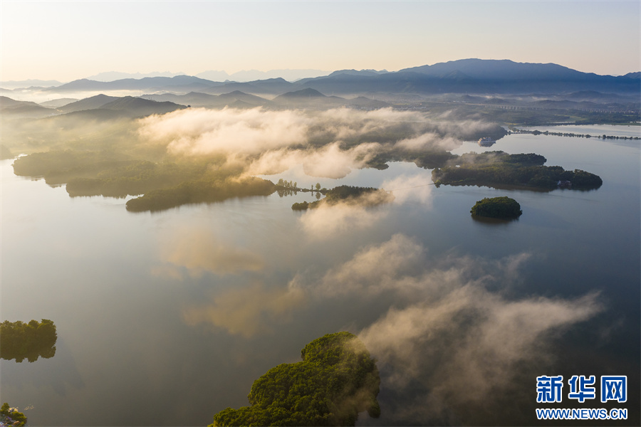 9月15日清晨,无人机视角下的安徽省池州市平天湖美不胜收。绿水青山在云雾的掩映下,构成一幅动态的山水画卷。新华网发(饶治国 摄)