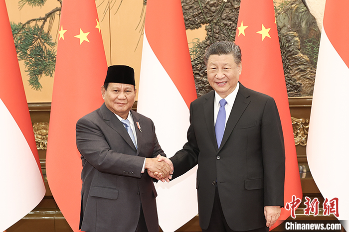 中新社北京4月1日电 4月1日下午,中国国家主席习近平在北京人民大会堂同印尼当选总统普拉博沃举行会谈。