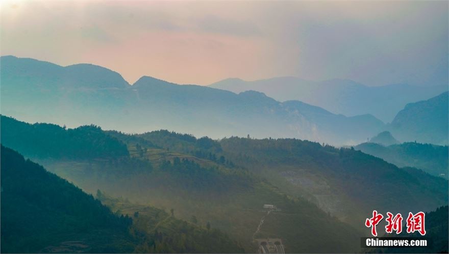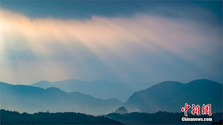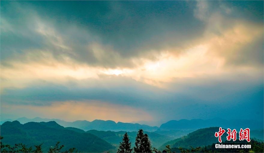 2024年9月11日清晨,重庆市酉阳土家族苗族自治县丁市镇境内,秋日刚好露出云层时,下起了小雨,雨中的山峦显得朦朦胧胧,天空中的霞光斜射过彩云,形成了一幅绚丽多彩的图画。