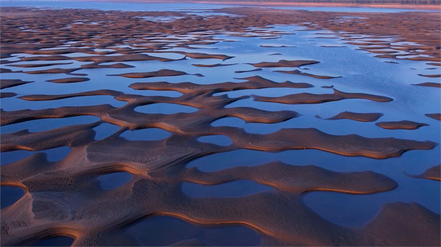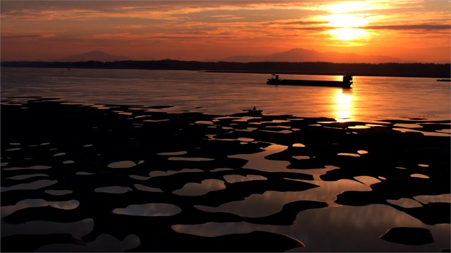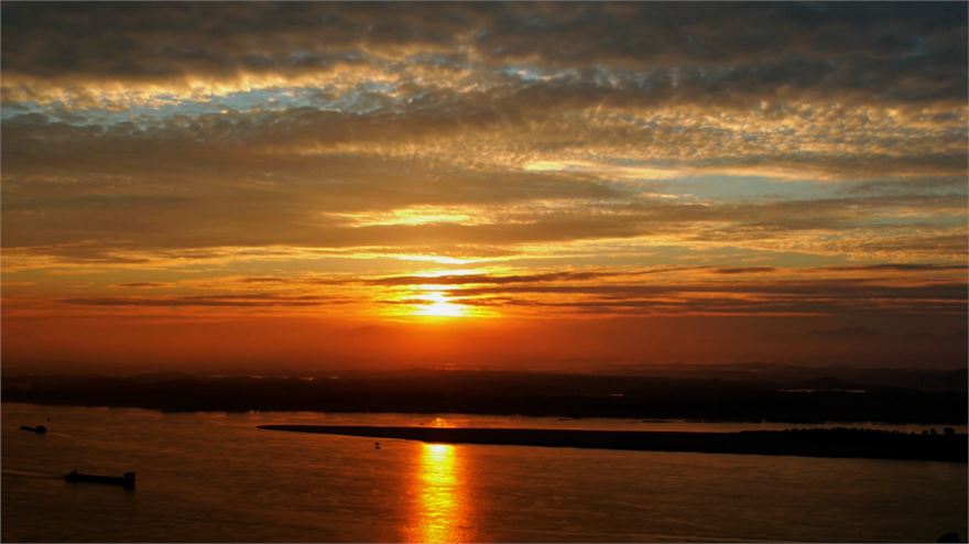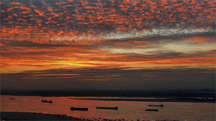 秋日清晨,位于安徽省望江县雷池镇的长江岸边朝霞满天,江面波光粼粼,一片秋日美好风光。