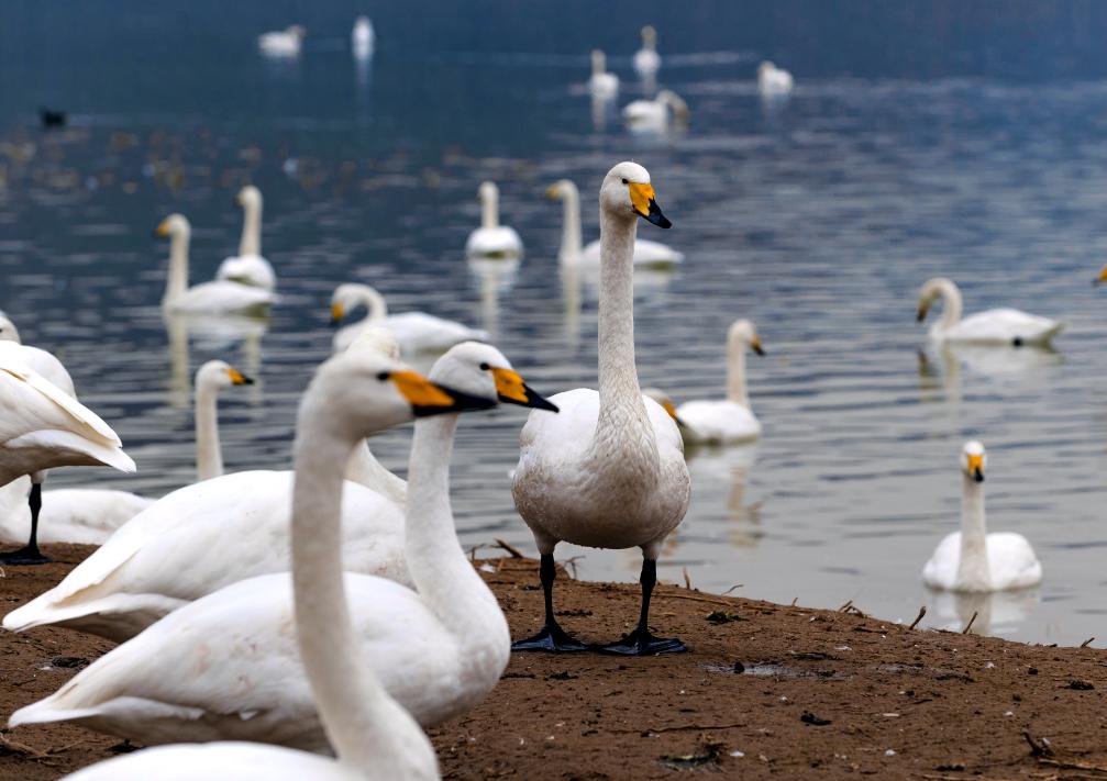 大天鹅在山西芮城圣天湖栖息越冬。(薛俊 摄)