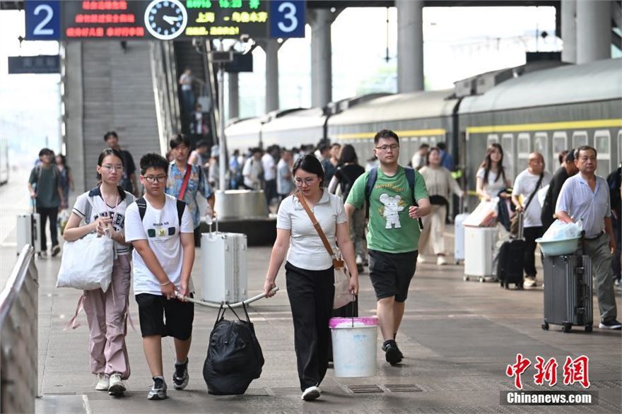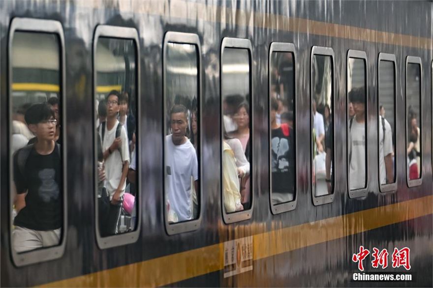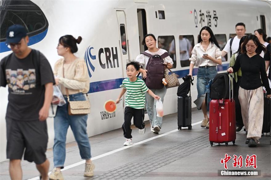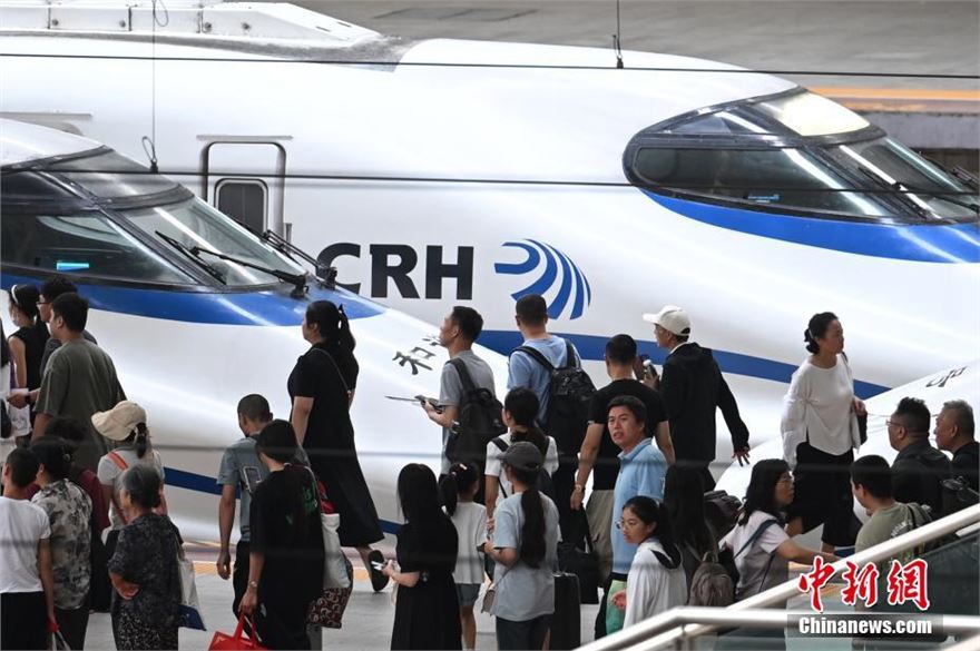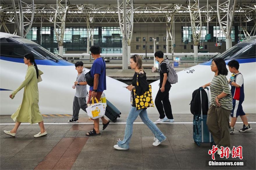 8月26日,江苏南京,旅客们在火车站出行。当日,中国国家铁路集团有限公司发布最新消息,自暑运启动以来(7月1日至8月25日),全国铁路累计发送旅客8.02亿人次,同比增长6.2%,日均发送旅客1433万人次。