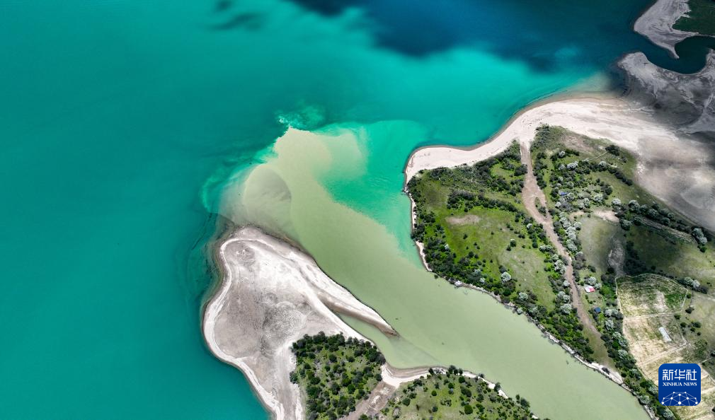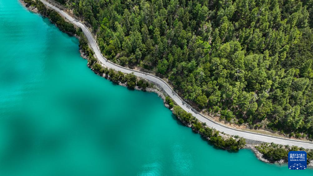 巴松措岸边蜿蜒的公路(5月28日摄,无人机照片)。