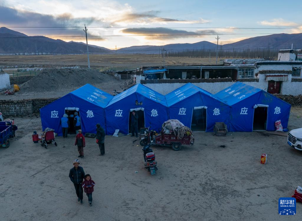 1月7日,在拉孜县曲下镇土林村,受灾群众搬入应急帐篷(无人机照片)。