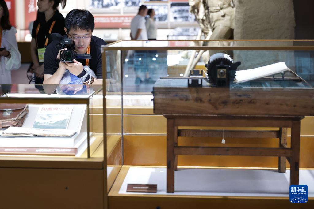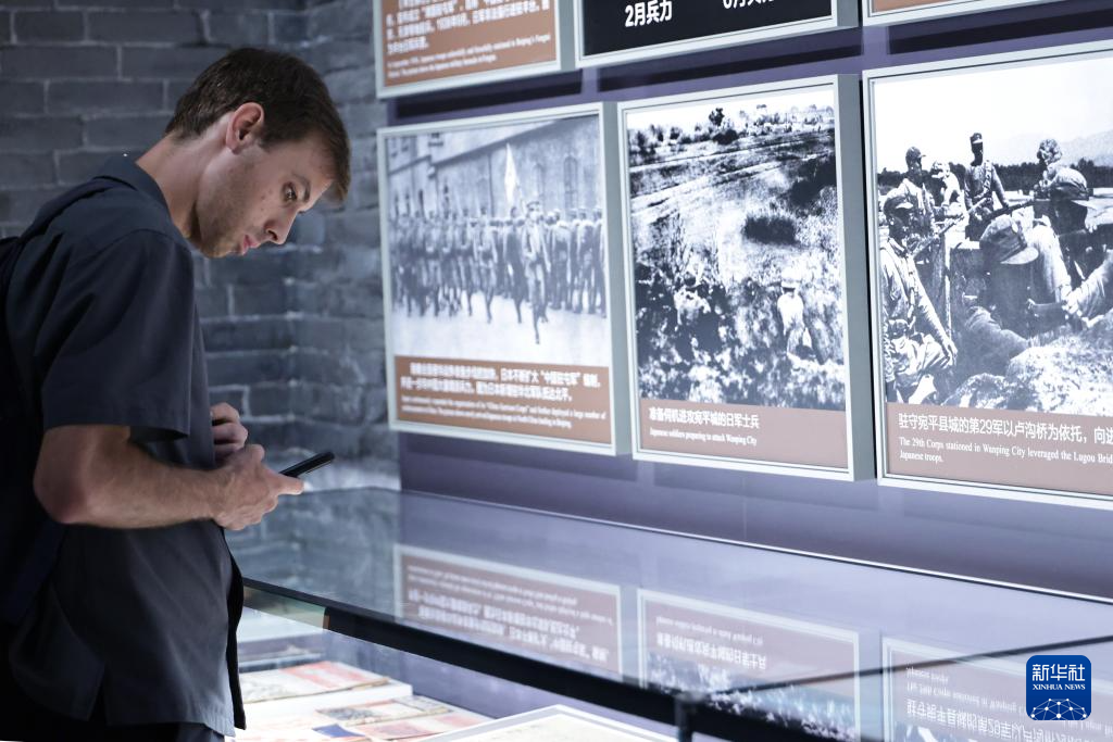 8月27日,中外媒体记者在中国人民抗日战争纪念馆内采访。新华社记者 张玉薇 摄