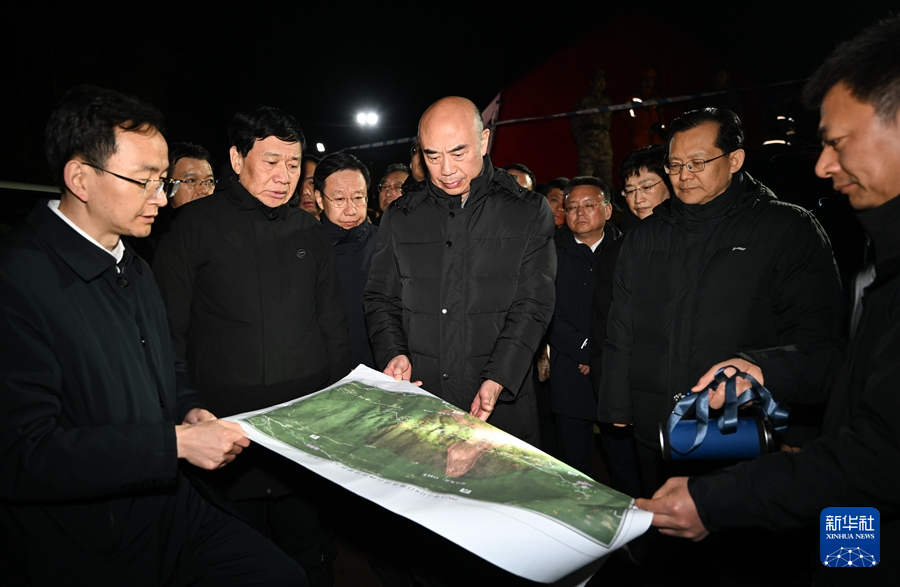 根据习近平总书记重要指示和李强总理要求,中共中央政治局委员、国务院副总理刘国中2月8日夜赶赴四川宜宾市山体滑坡灾害现场指导搜救和应急处置工作。这是2月9日凌晨,刘国中在筠连县沐爱镇金坪村抢险处置现场,实地查看灾害情况,了解救援进展与后续安排。新华社记者 李响 摄