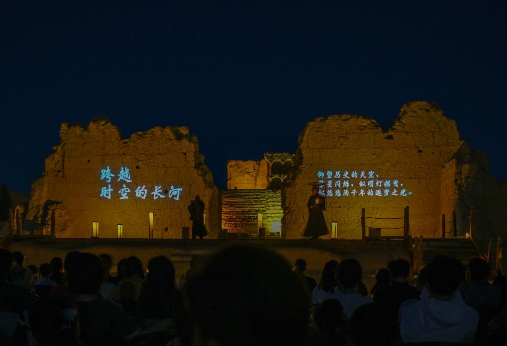 深蓝色夜幕下,两排户外灯照亮高大残旧的城墙。身着僧侣服饰的演员双手合十、怀抱经卷,从夜色中走来。时钟随着他的朗诵,仿佛回转到佛教鼎盛期的唐代西域。在舞台前方席地而坐的游客,看得如醉如痴。