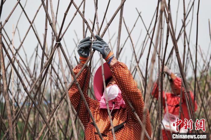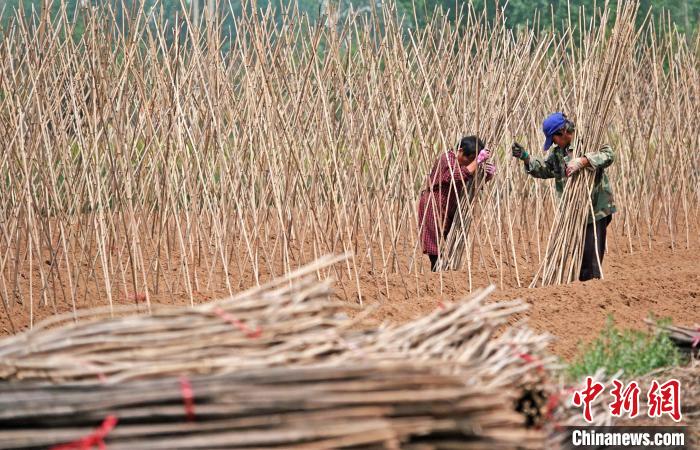 村民给种植的山药苗搭建藤苗架子。高新生 摄