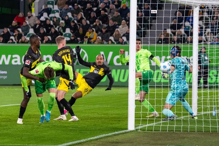 多特蒙德队马伦(右三)门前抢点破门。图片来自德甲官网