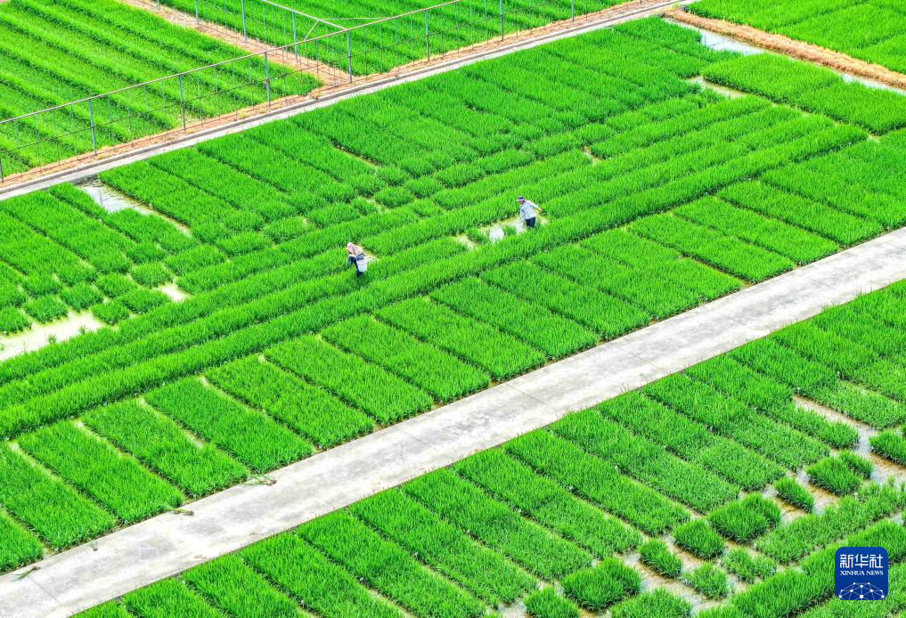 7月7日,在江苏里下河地区农科所(扬州市农科院),农民在试验田劳作(无人机照片)。
