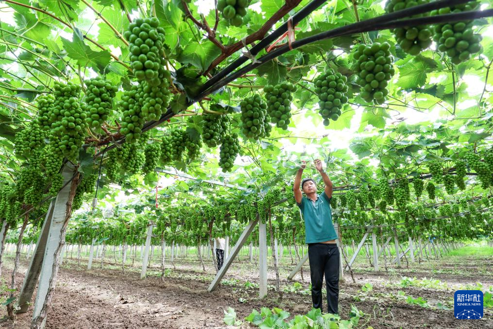 7月7日,河北省晋州市东里庄镇的葡萄园里,果农忙着修枝打杈。