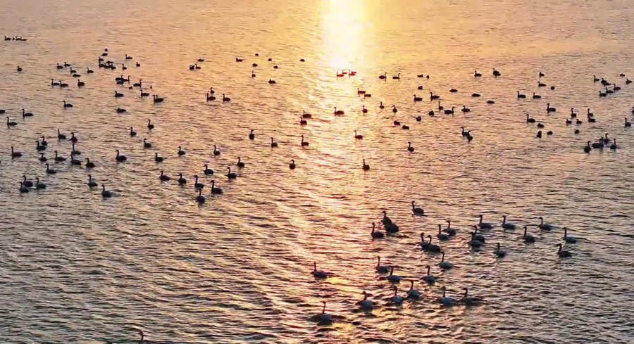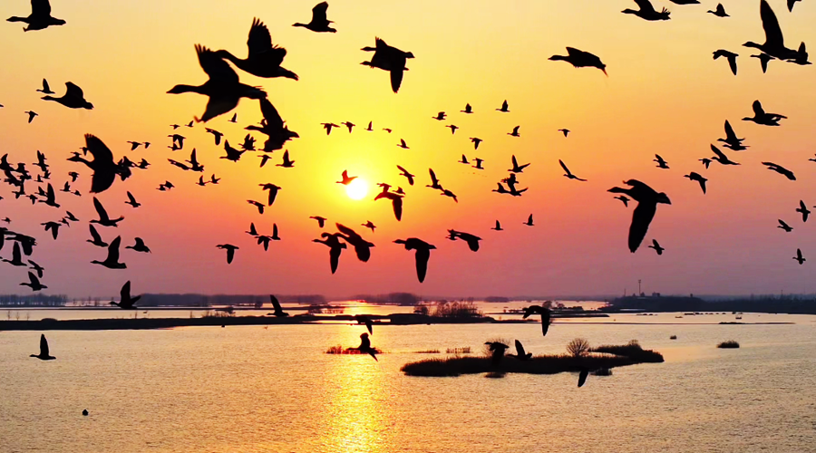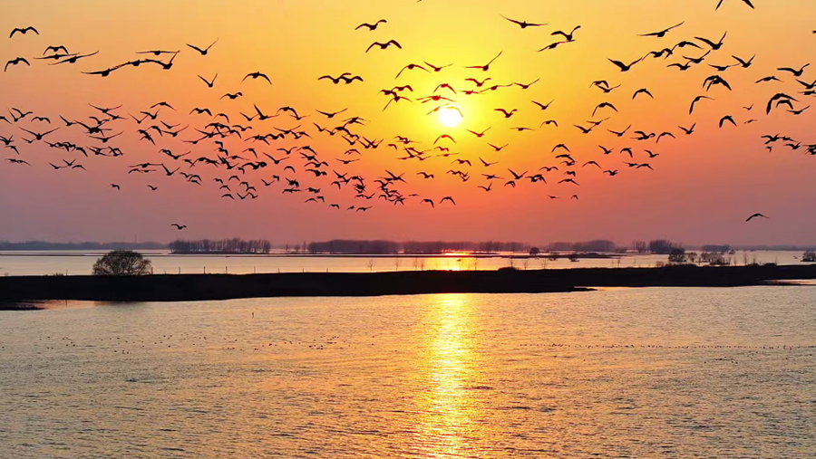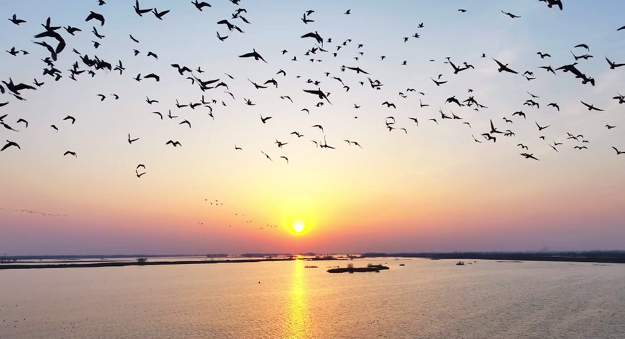 初春时分,在夕阳余晖映照下,安徽省颍上县秋家湖湿地被染上一层梦幻般的色彩。放眼望去,成群飞鸟与漫天霞光融为一体,绘就出一幅壮美而灵动的生态画卷。(徐红梅)