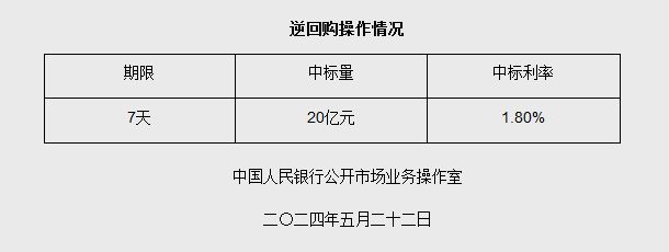 中新网5月22日电 据中国人民银行网站消息,为维护银行体系流动性合理充裕,2024年5月22日人民银行以利率招标方式开展了20亿元逆回购操作。具体情况如下: