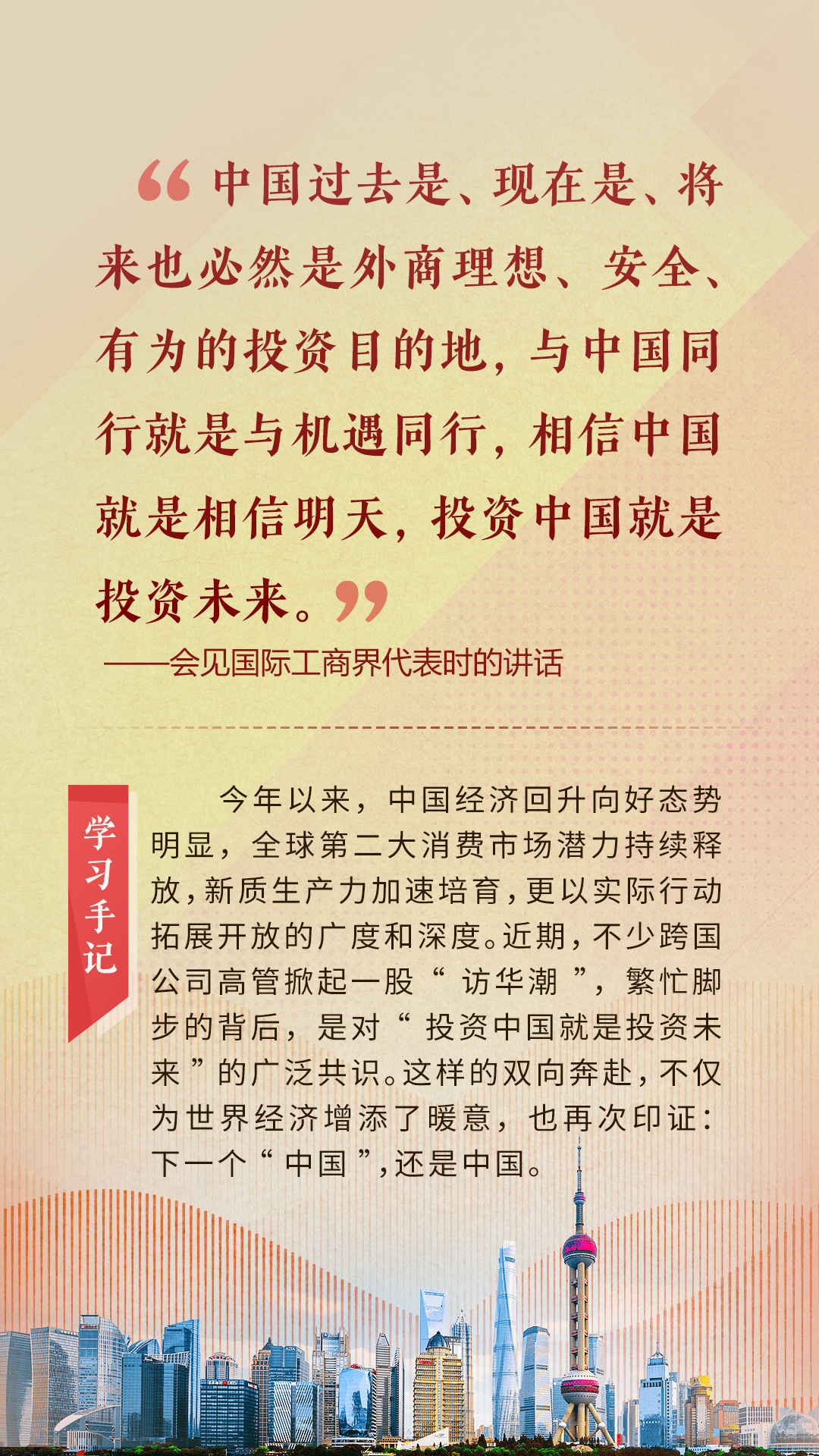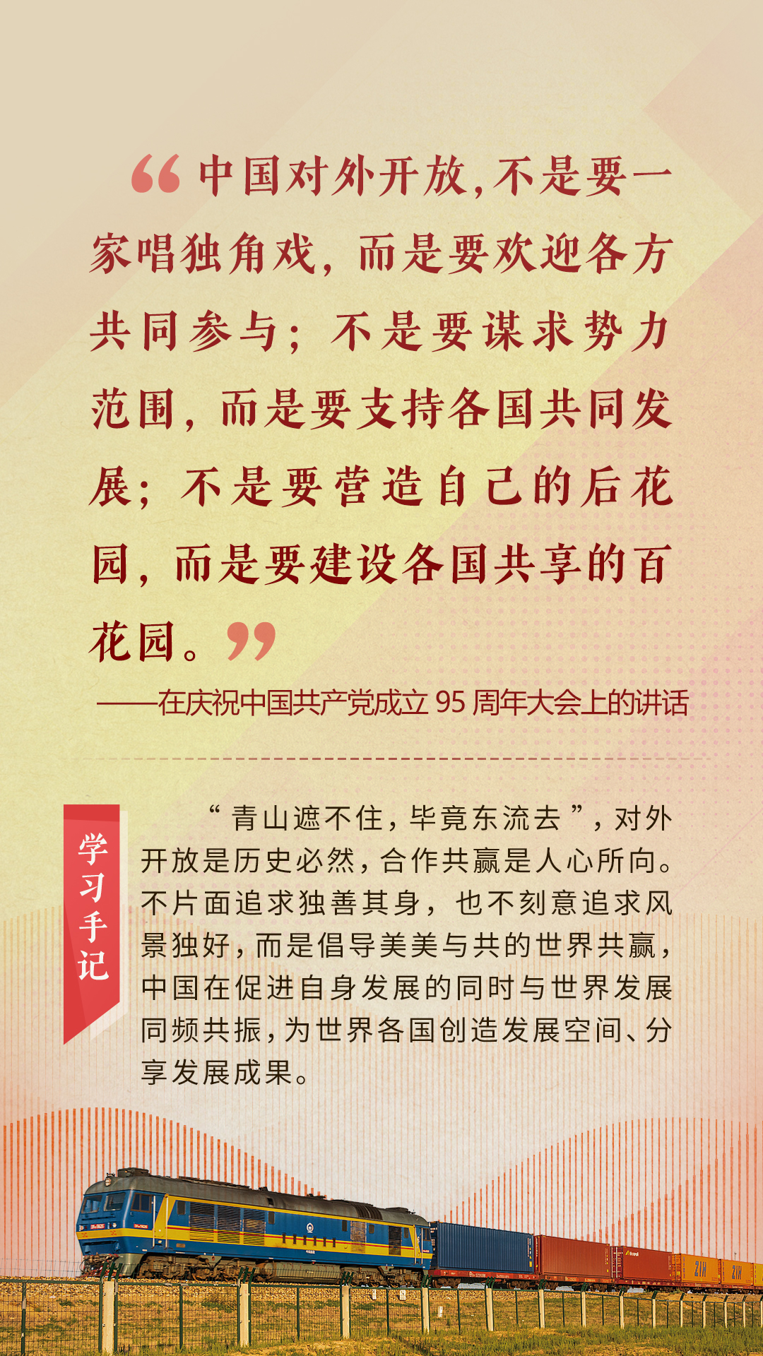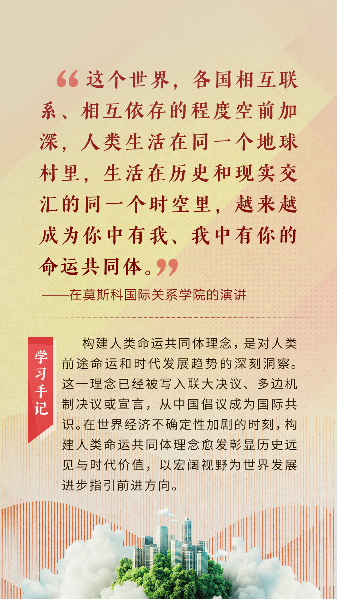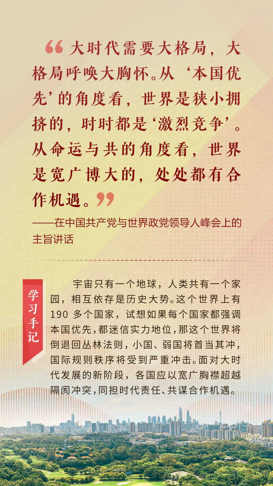 “天空足够大,地球足够大,世界也足够大,容得下各国共同发展繁荣”“你中有我、我中有你的命运共同体”“与中国同行就是与机遇同行”……习近平总书记一次次在重要场合发表重要讲话,指引我们站在历史正确的一边,站在人类进步的一边,不畏浮云、登高望远,不惧风浪、勇毅前行。