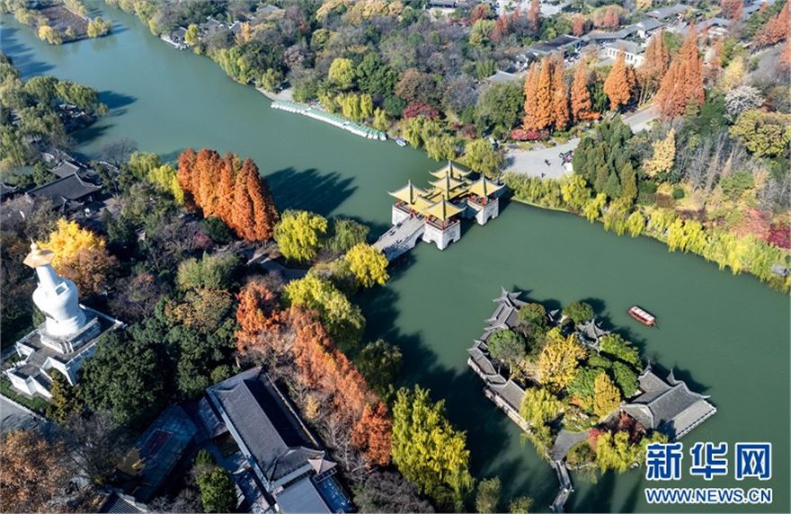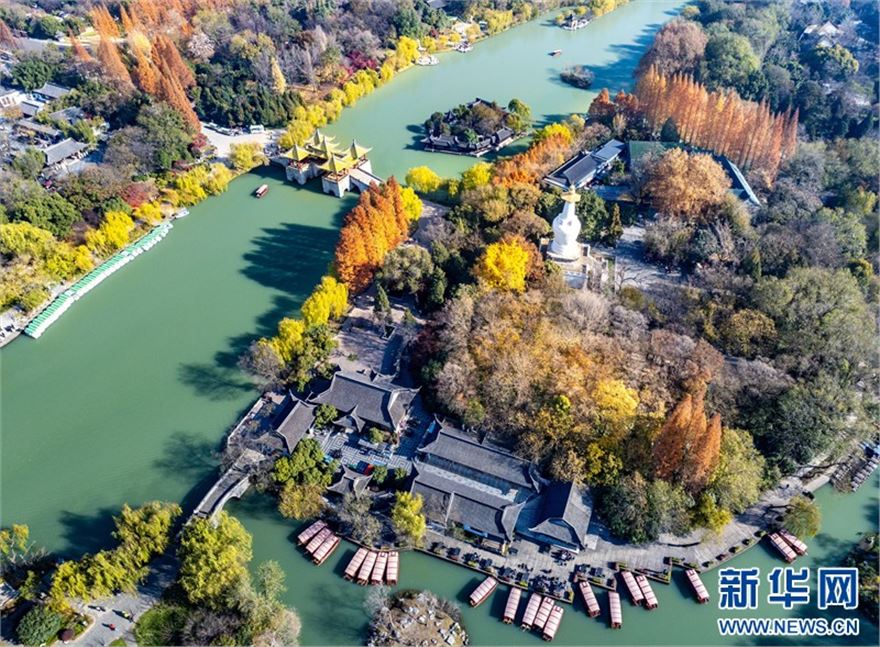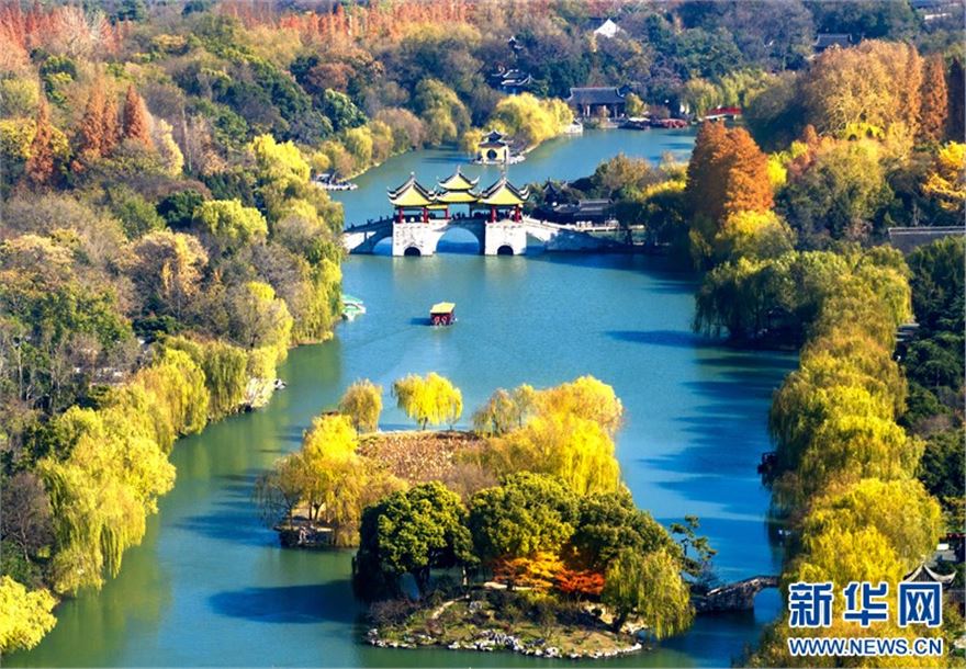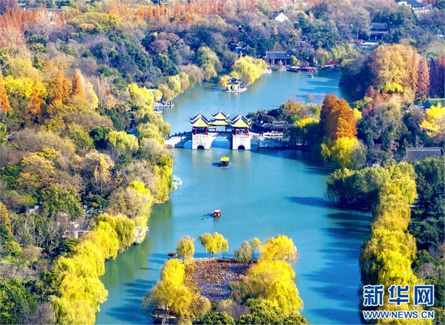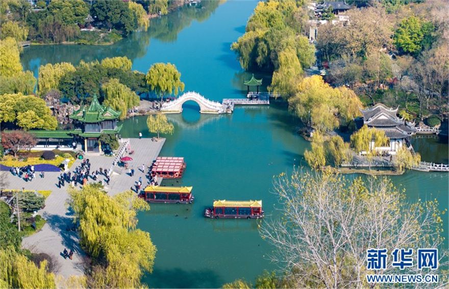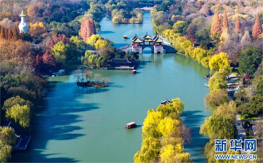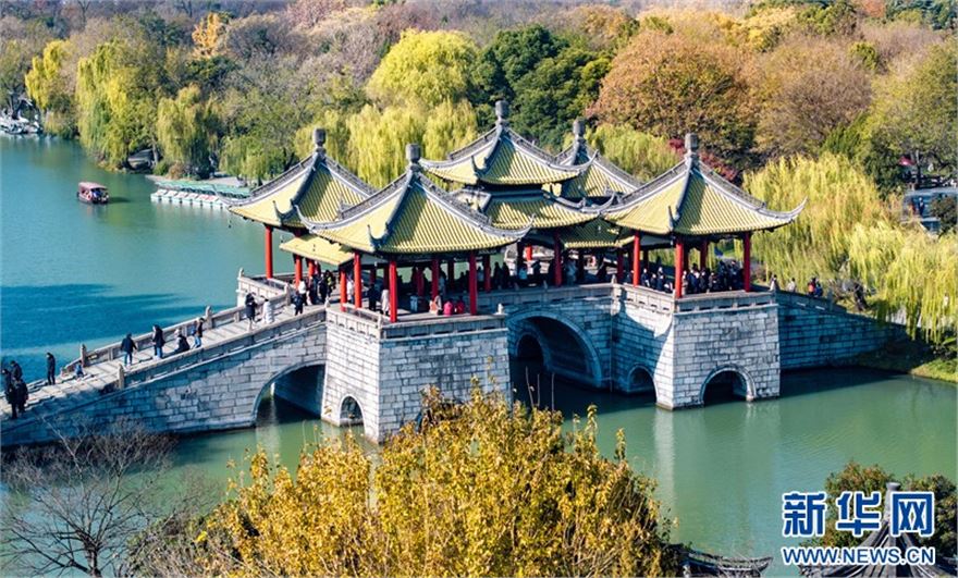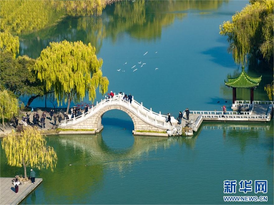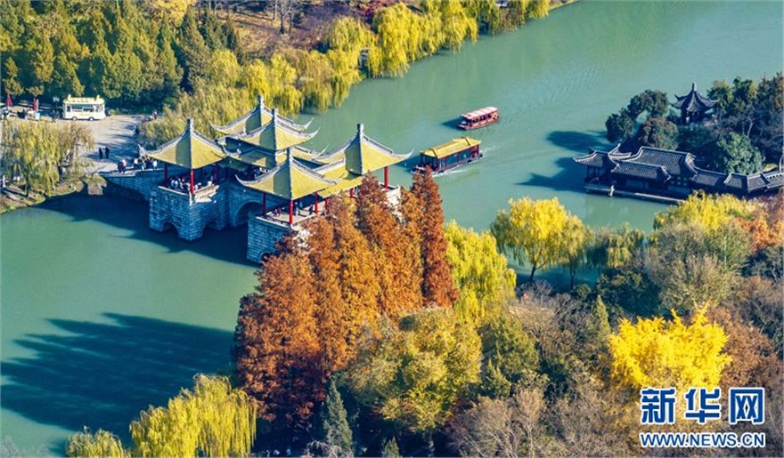 近日,江苏扬州瘦西湖风景区层林尽染、景色迷人,在蓝天白云的映衬下呈现出一幅美丽的冬日画卷,吸引不少游客前来赏景游玩。(沙佳仪 周社根)