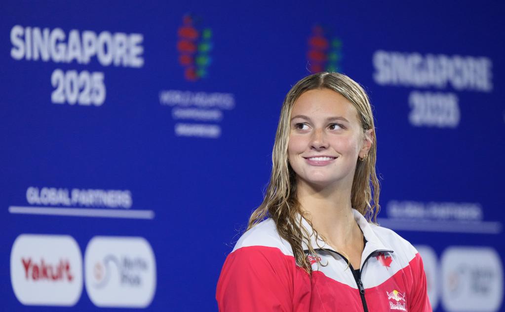 8月3日,2025年世界游泳锦标赛女子400米个人混合泳决赛在新加坡举行。图为冠军加拿大选手麦金托什在颁奖仪式上。新华社记者雒圆摄