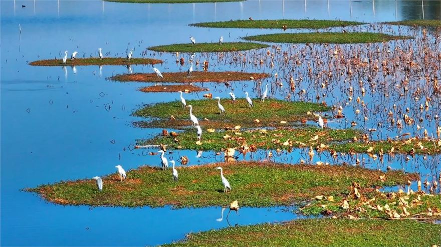 近日,在安徽省含山县环峰塘湿地,成群水鸟觅食嬉戏,勾勒出一幅自然和谐的生态美景。