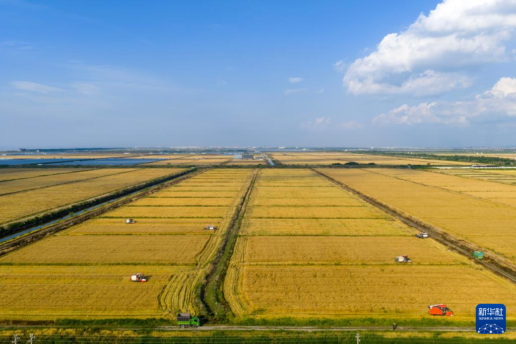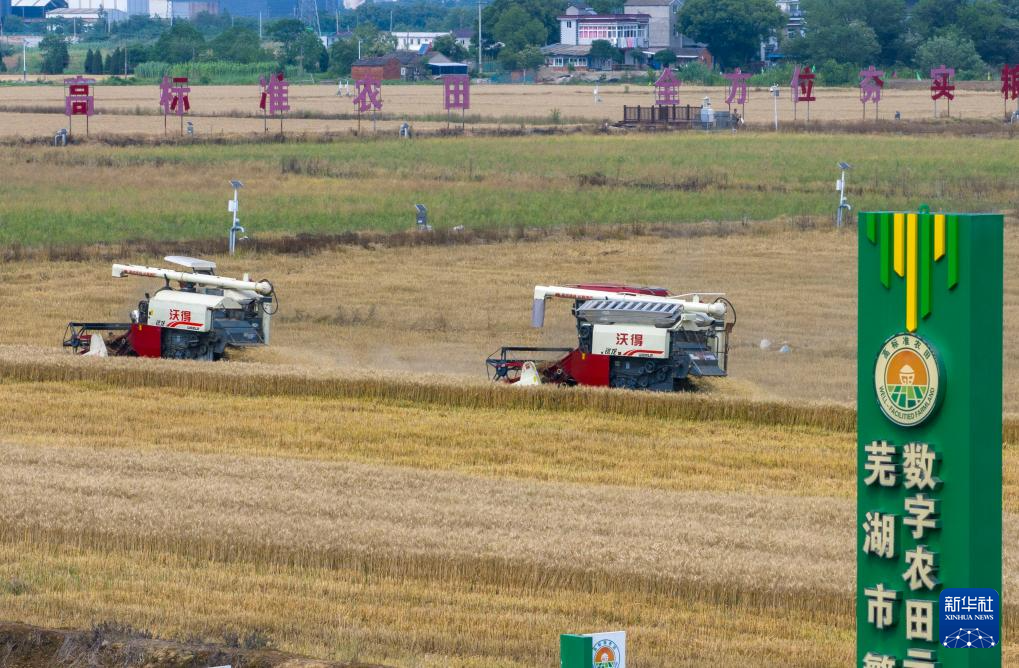 5月17日,在安徽省芜湖市繁昌区新港镇新东村数字农田里,农机手驾驶农机收割小麦(无人机照片)。