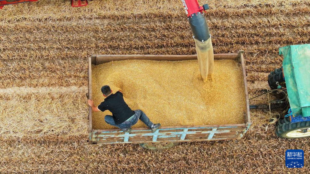 5月16日,在河南省南阳市社旗县郝寨镇,收割机在收割小麦。