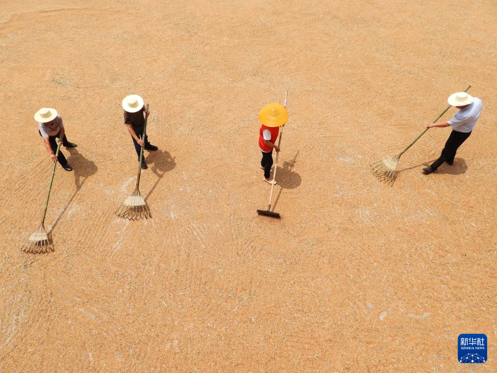 5月16日,在四川省达州市渠县文崇镇学堂村,种粮大户在晾晒刚收获的小麦。