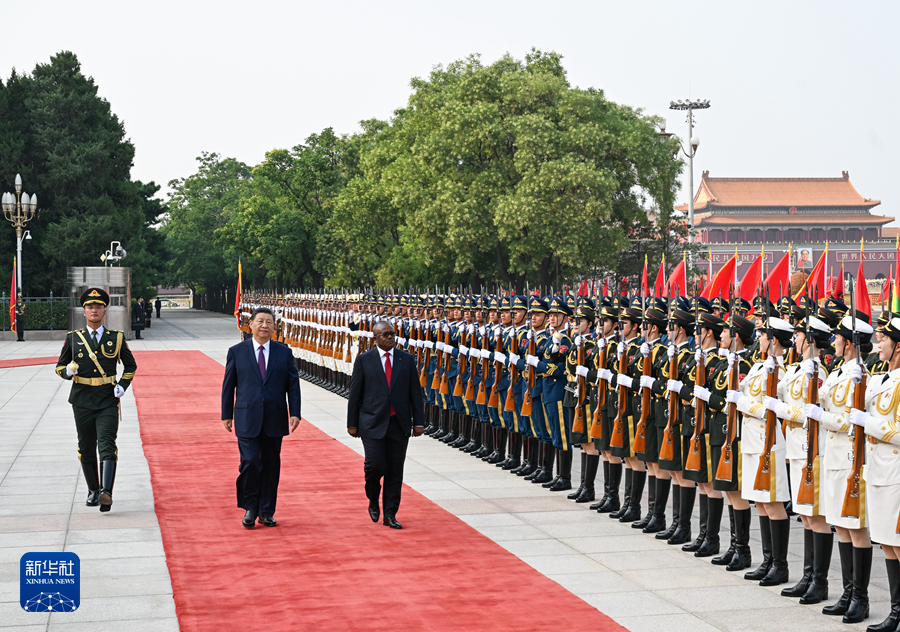 7月10日下午,国家主席习近平在北京人民大会堂同来华进行国事访问的几内亚比绍总统恩巴洛举行会谈。这是会谈前,习近平在人民大会堂东门外广场为恩巴洛举行欢迎仪式。新华社记者 饶爱民 摄