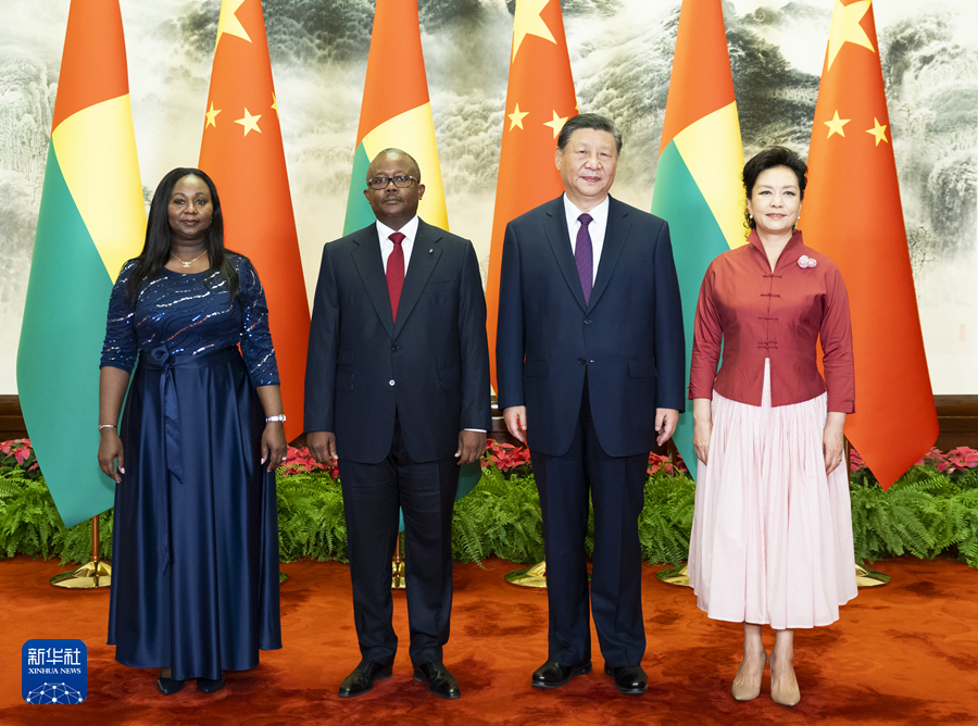 7月10日下午,国家主席习近平在北京人民大会堂同来华进行国事访问的几内亚比绍总统恩巴洛举行会谈。这是会谈前,习近平和夫人彭丽媛同恩巴洛和夫人迪尼西娅合影。新华社记者 黄敬文 摄