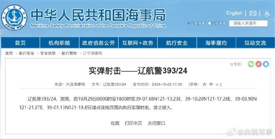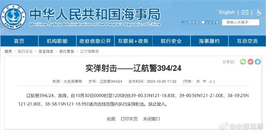 据中国海事局网站消息,大连海事局发布航行警告,10月29日0时至18时,10月30日0时至12时,渤海部分海域执行实弹射击,禁止驶入。