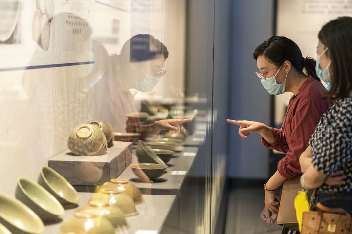 2022年9月,漳州市博物馆举办“漳州市圣杯屿元代海船遗址水下考古成果展”,市民欣赏圣杯屿水下考古发掘的龙泉窑青瓷瓷器。张旭 摄